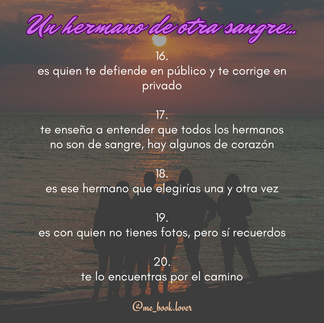 Un hermano de otra sangre es una persona que quizás no te ha llegado a ver nacer, pero desde que apareció es la luz que te ilumina. Todos sabemos que es muy difícil encontrar a una persona así, que no sea de sangre pero sí de corazón. Son esas personas que a pesar de hacernos de rabiar, nunca van a juzgarnos por nada. Nos defienden cuando estamos delante, pero sobre todo cuando no estamos presentes. Ellos estuvieron cuando nadie más lo estuvo y la conexión es tan fuerte que os confunden como familia. El verdadero significado de hermano de otra sangre es "RESISTE EL TIEMPO, LA DISTINTA Y EL SILENCIO".